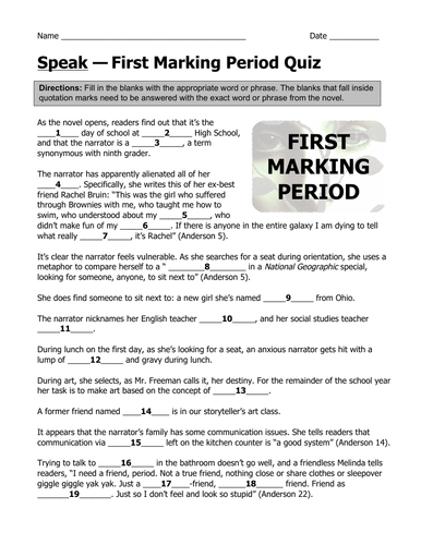 Speak By Laurie Halse Anderson First Marking Period Quiz With Answer Key Teaching Resources